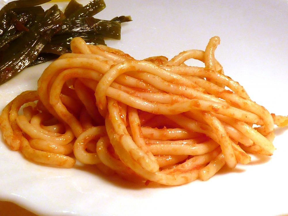 スパゲッティ横でフィルムケースに収まっている付け合わせの「茎さつま」。耳慣れない名前だが、サツマイモの茎だそうだ。かつお出汁で炊いてある。口に含むとジュワっと出汁が流れ出て、唐辛子の僅かな辛さとほどよい甘みを感じる。箸休めにちょうどよい。