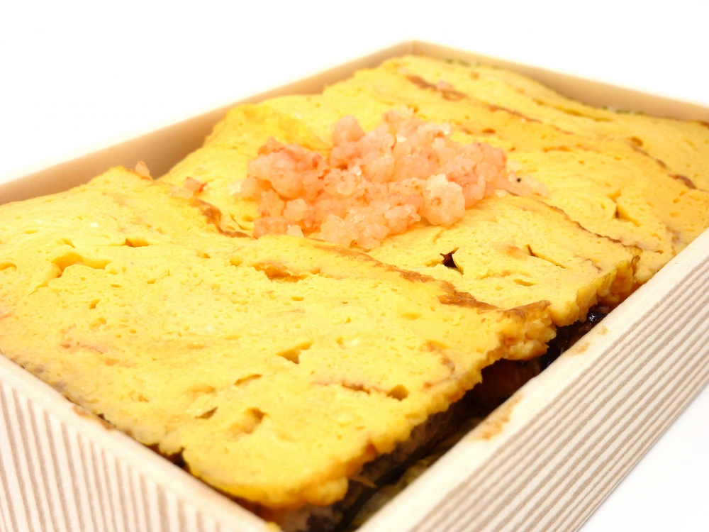 まずは、玉子焼きの上に盛り付けられている「むき海老のおぼろ」である。きれいなピンク色をしており、見た目とアクセントの両方を担っている。おおよそ、全体で大匙一杯程度の極少量ではあるが、食欲をかきたててるには十分な役割である。