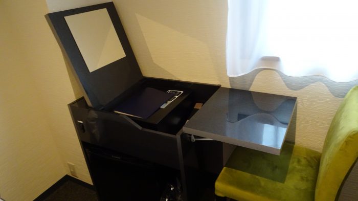 コンパクトな室内ですが、ドレッサーとデスクが兼用になっていたり、