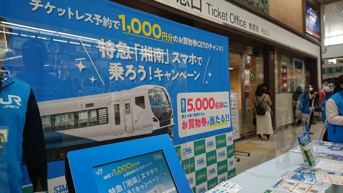 また、みどりの窓口の前ではチケットレス予約をした方に1,000円分のお買物券が当たるキャンペーンを実施しておりました。