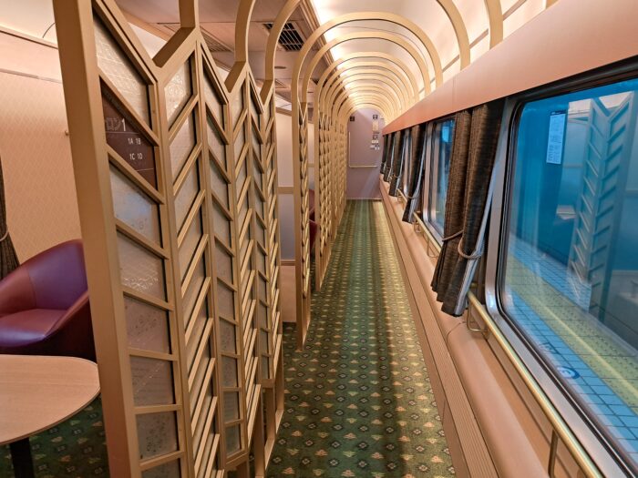 大阪、京都、奈良の3都市を結ぶ「あをによし」ですが、その車内もとても個性的。公式サイトでは「1300年前の歴史・文化を感じられる列車で、大阪・奈良・京都の魅力を存分に味わう。」という案内が書かれています。