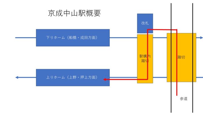 京成中山駅はこ線橋がないため、朝の通勤時間帯に上野や浅草線方面を利用する方は、今まで1回も踏切を通らずに利用していた駅が、これからは必ず改札前と改札後に踏切を通ることになります。