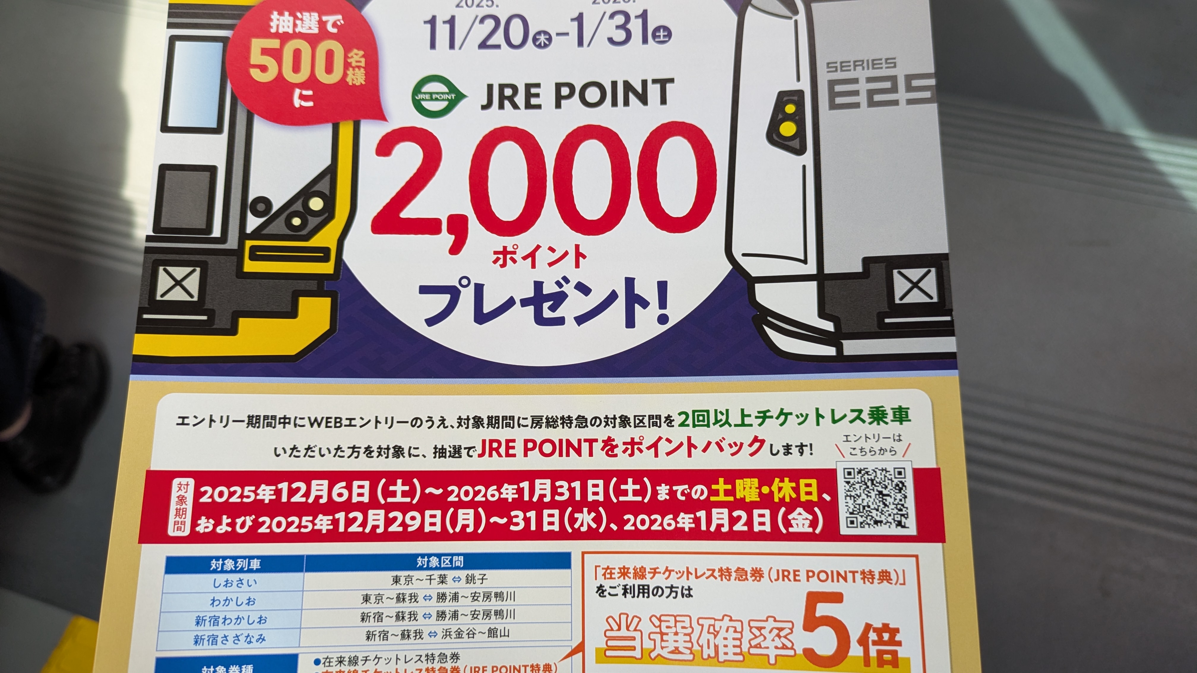 現在、対象期間に房総特急の対象区間を2回以上チケットレス乗車いただいた方を対象に、抽選で500名にJRE POINT2,000ポイントをポイントバックするキャンペーンを実施中。さらに、「在来線チケットレス特急券(JRE POINT特典)」でご利用いただくと、当選確率が5倍になります。