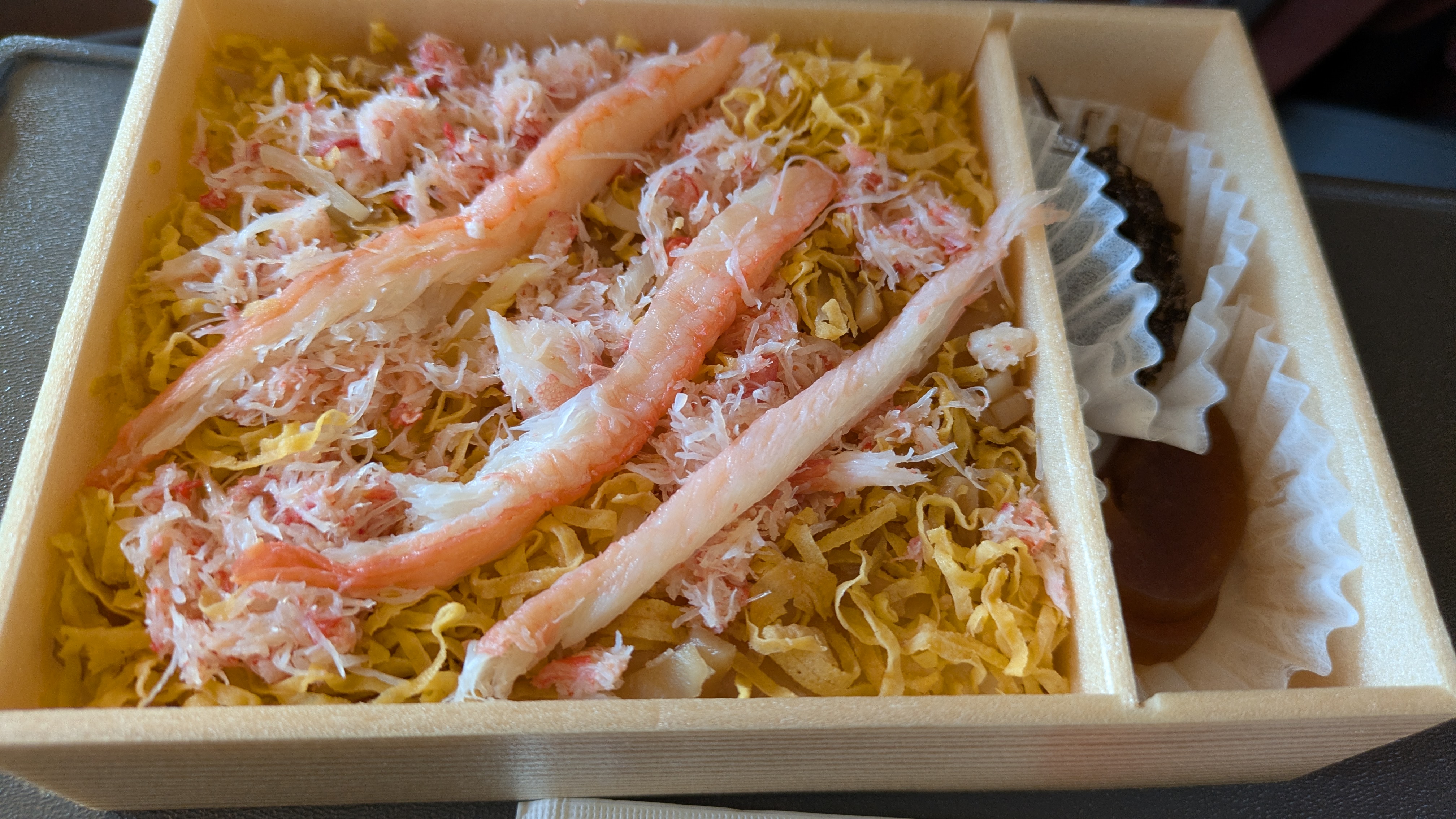 今回はかに寿し。酢飯の上に、錦糸卵とカニほぐし身とカニ脚がのっており、塩昆布と奈良漬けが副菜としてついてきます。