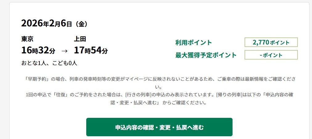 筆者も期間中に上田を往復することにしました。片道2,770ポイントで利用できるのは嬉しいですよね。